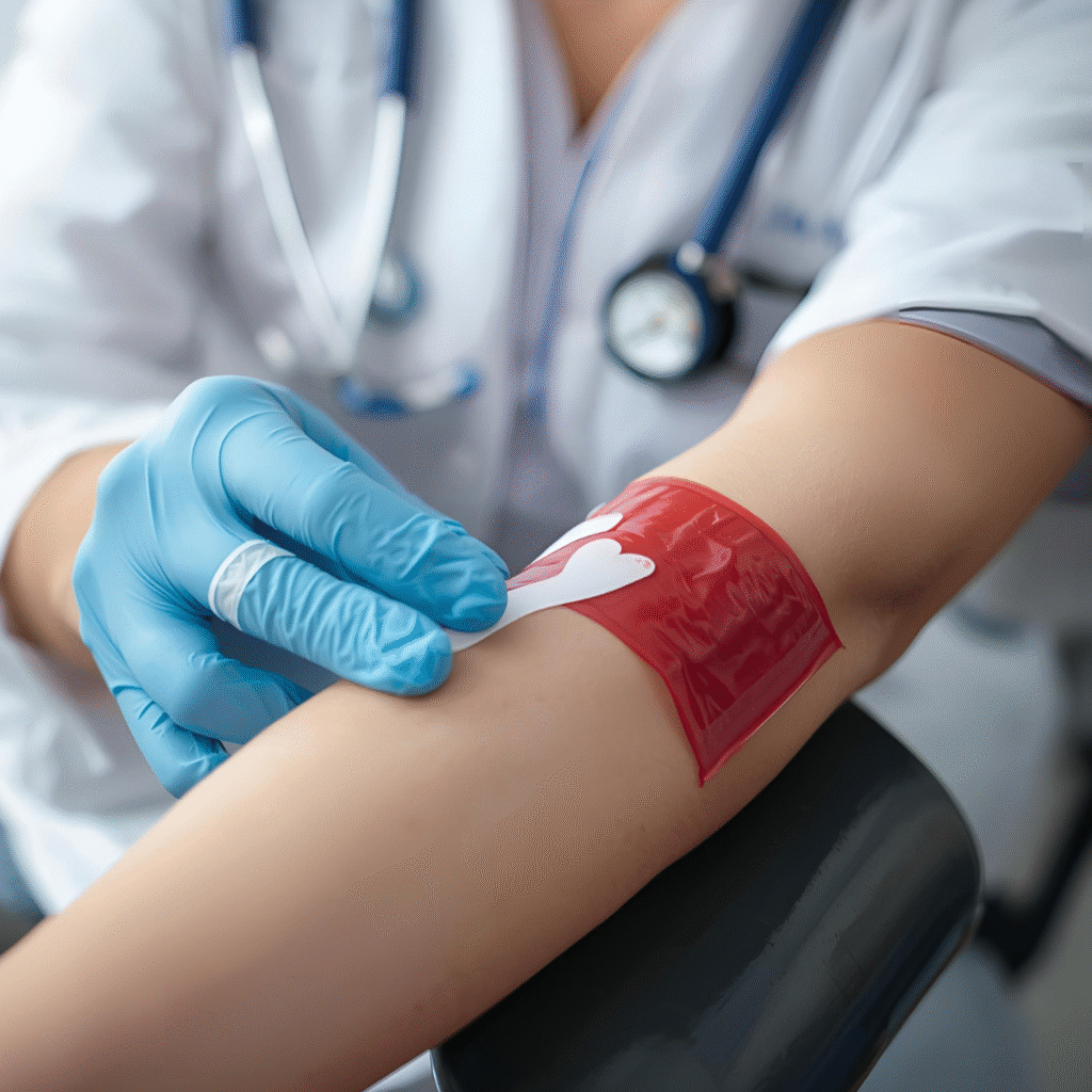 بعد الانتهاء، يتم إزالة الإبرة ويوفر الفني ضمادة للضغط على الموقع، مع توجيهات للمتبرع بالراحة لمدة 10 إلى 15 دقيقة.